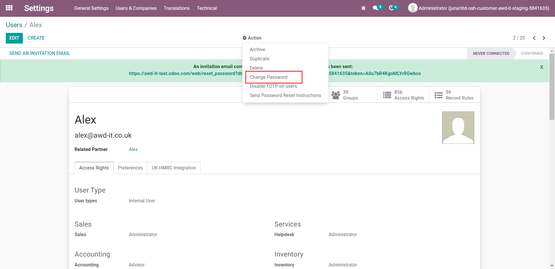 2). Click on the Action button on the top header and click on the Change Password Option.
