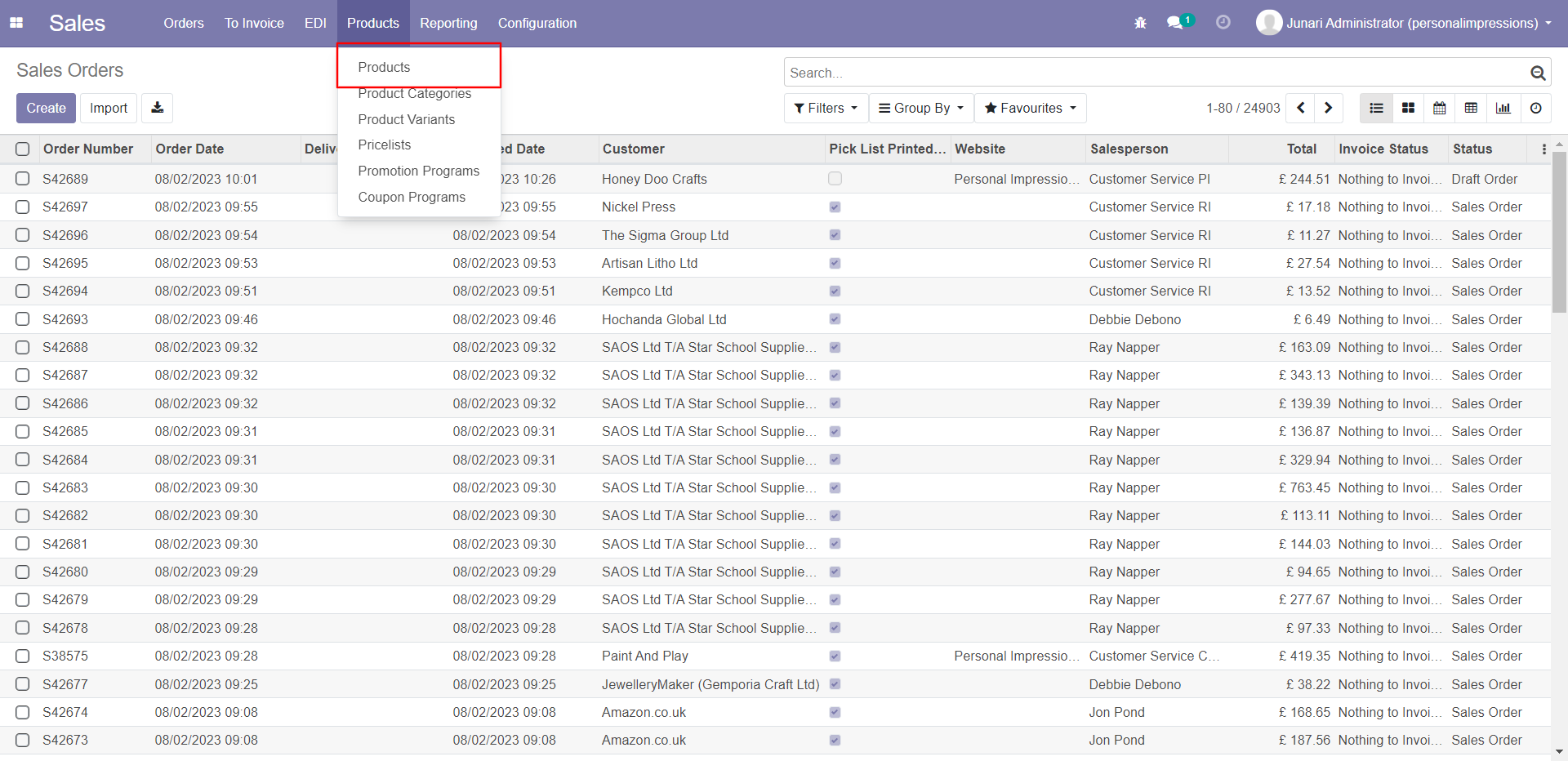 1). Go to Sales > Products > Products. This will take you to the product list view.
