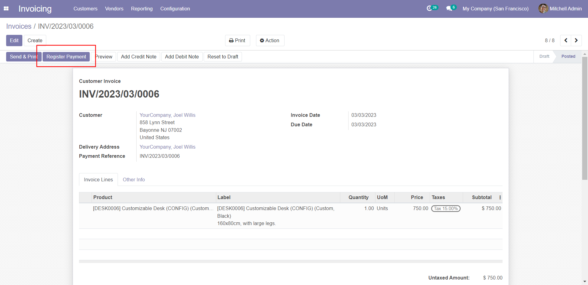 Step 1: Open any confirmed invoice and click on theĀ 'Register Payment' button from the header.
