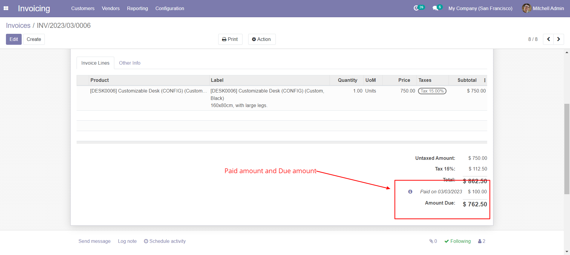 Step 3: Once you hit the Create Payment button it will update the paid amount and the remaining amount to the invoice.