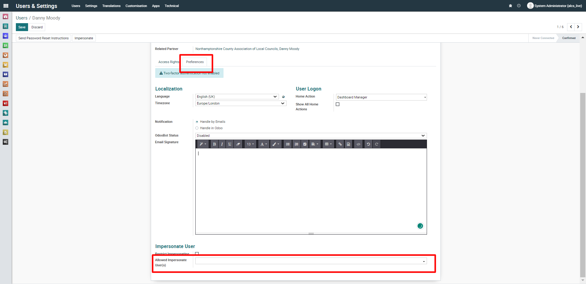 3) Assign Allowed users to impersonate. Click on the preference and select the user's account on the Allowed Impersonate User(s) field.