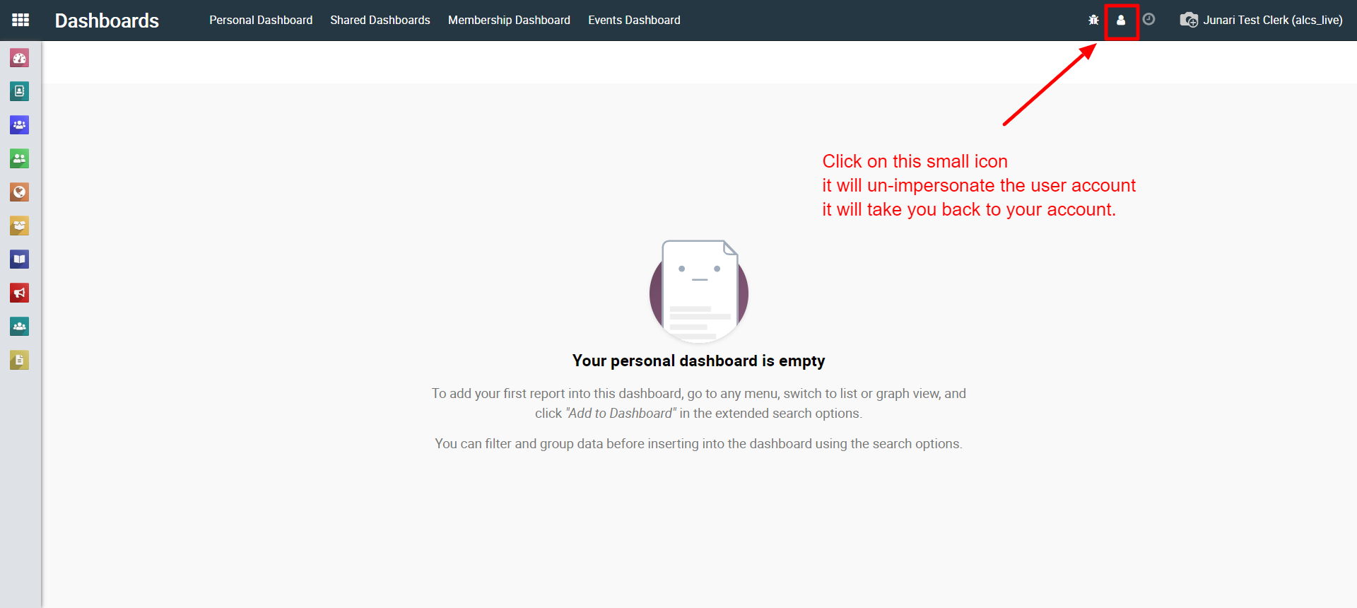 5) To cancel the impersonation (i.e. return to your account), click the icon indicated in the image below.
