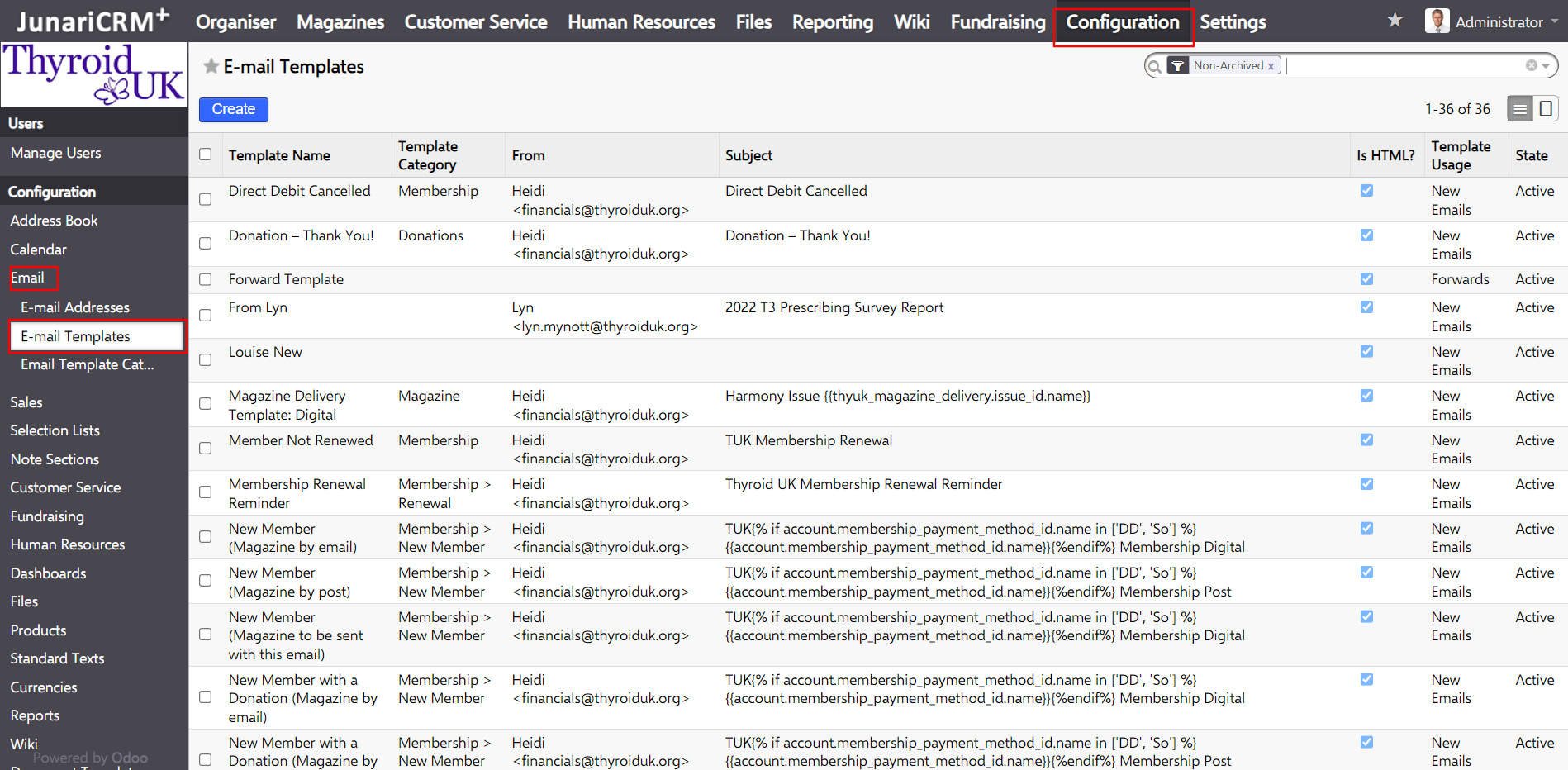1) Access the "Configuration" tab, select "Email," and click "E-Mail Templates." Open the email template that you want to add an image to in edit mode.