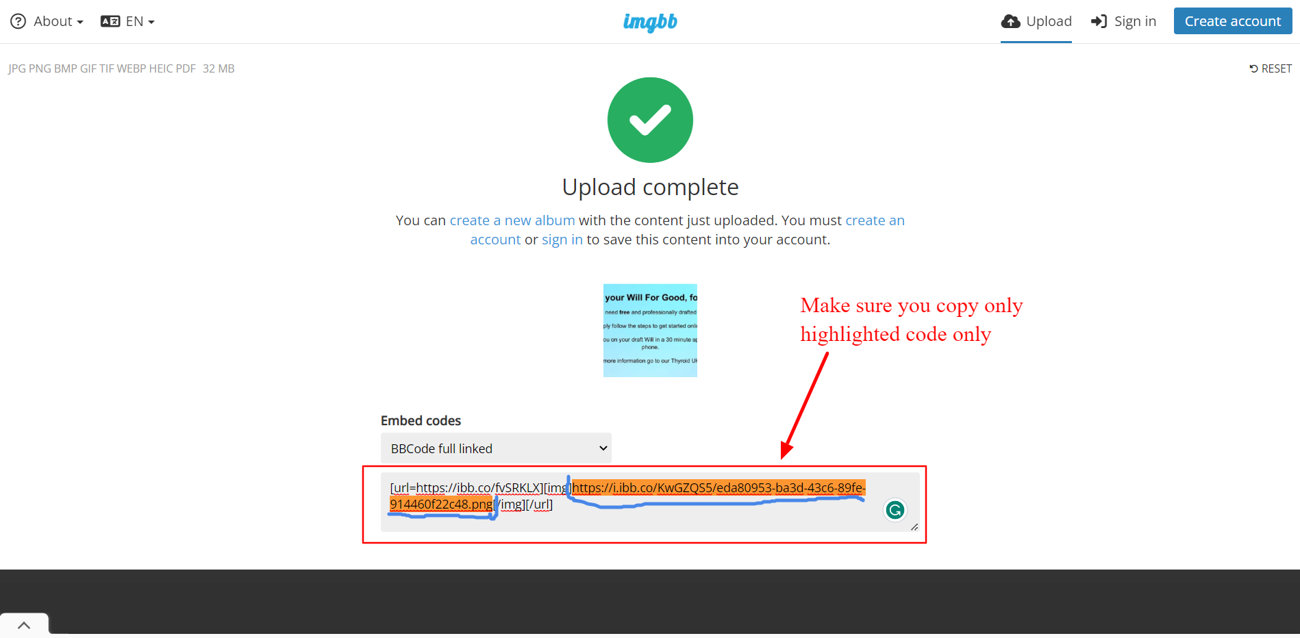 3) Once the image is uploaded successfully, change the code option to BBCode Full linked and copy the highlighted code in the Screenshot.