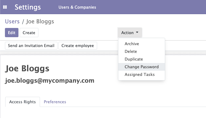 To change a user’s password, access the user’s record through Settings → Users & Companies → Users